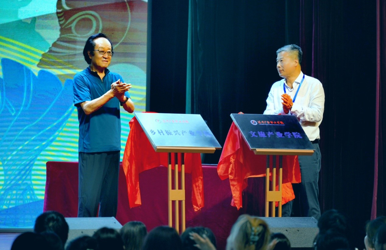 會上,宣讀了推進文體旅融合發展工作委員會成立文件及委員名單,頒發了委員會委員代表聘書,為省職教社文體旅融合發展研究實踐基地、文創產業研究實踐基地、體育健康產業研究實踐基地、文化產業(牛河梁)研究實踐基地、旅游產業研究實踐基地頒發牌匾,并為鄉村振興產業學院和文旅產業學院揭牌。