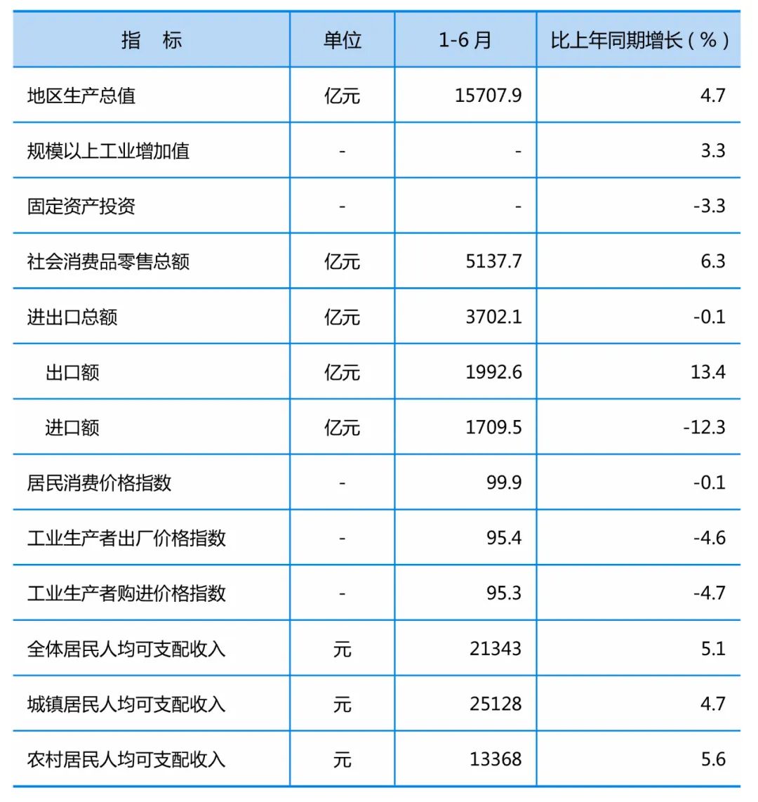 根據地區生產總值統一核算結果,上半年,全省地區生產總值15707.9億元,按不變價格計算,同比增長4.7%。分產業看,第一產業增加值964.3億元,增長4.3%;第二產業增加值5438.4億元,增長3.5%;第三產業增加值9305.2億元,增長5.3%。