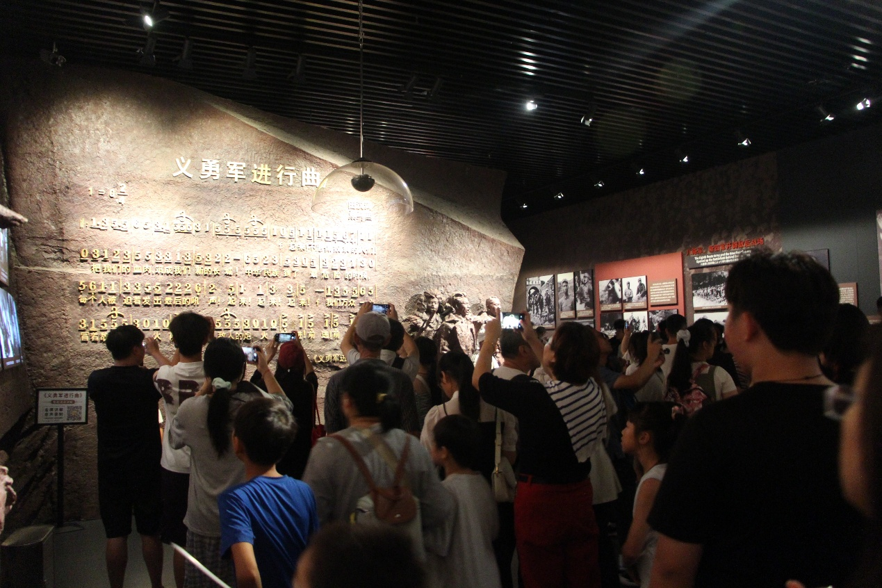 “起來!不愿做奴隸的人們!把我們的血肉,筑成我們新的長城……”在展廳的國歌墻前,一句歌聲打破寂靜,不知是誰起頭唱起了國歌,隨后一群少年加入合唱?!懊爸鴶橙说呐诨?,前進!前進!前進!進!”唱到最后,歌聲仿佛成了吶喊,周圍的參觀者沒人發出聲音,展館內只有《義勇軍進行曲》的鏗鏘旋律在回蕩。
